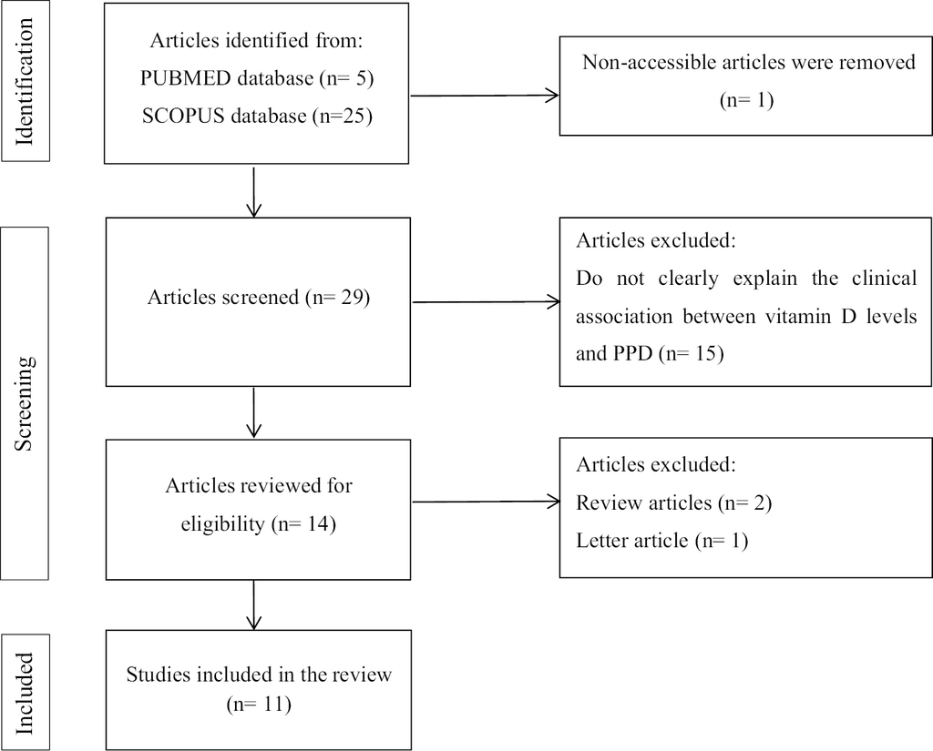 Original research articles in English published between 2012 and 2022 are eligible for inclusion. Articles that did not discuss the relationship between vitamin D and PPD were not considered.